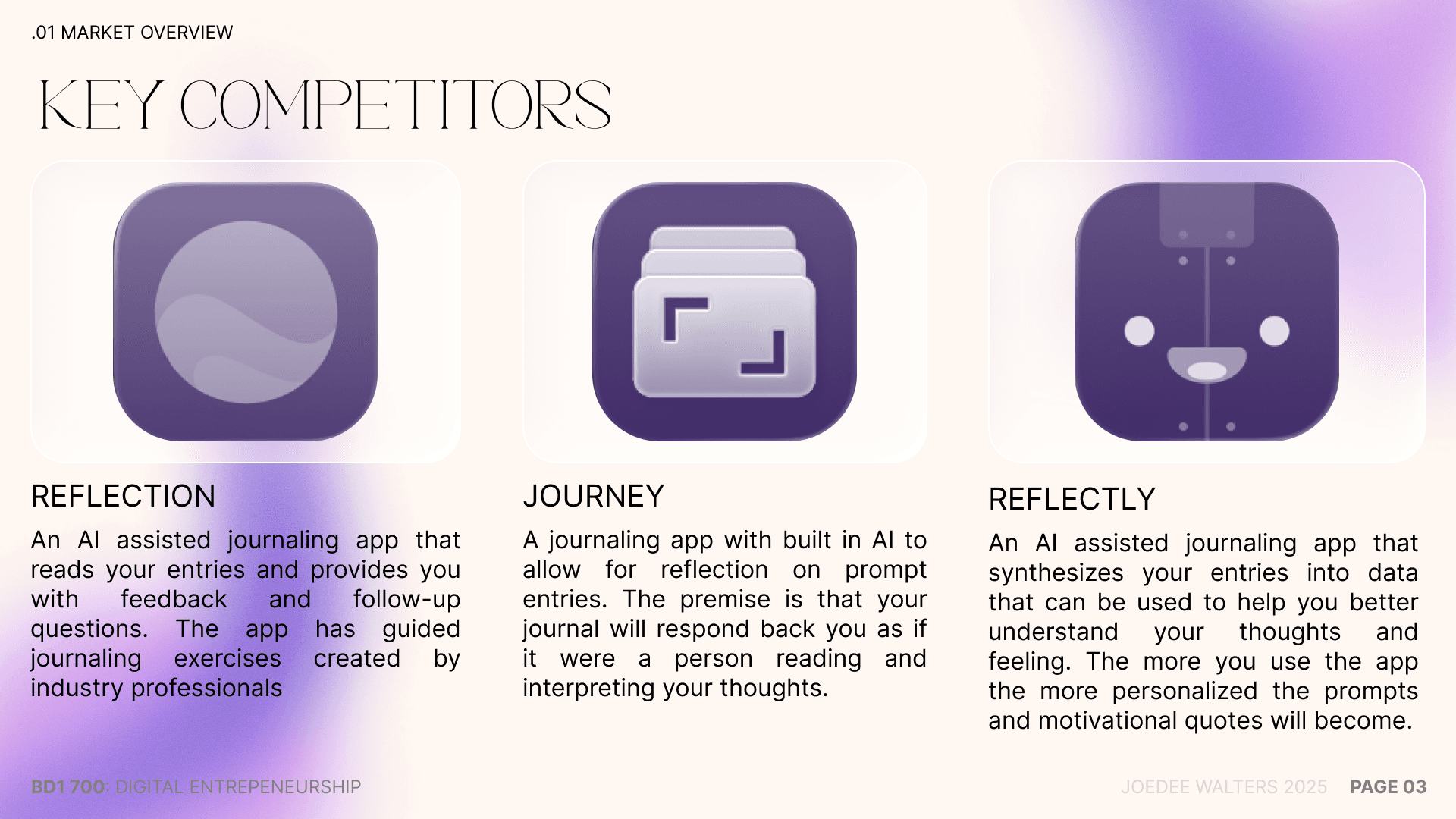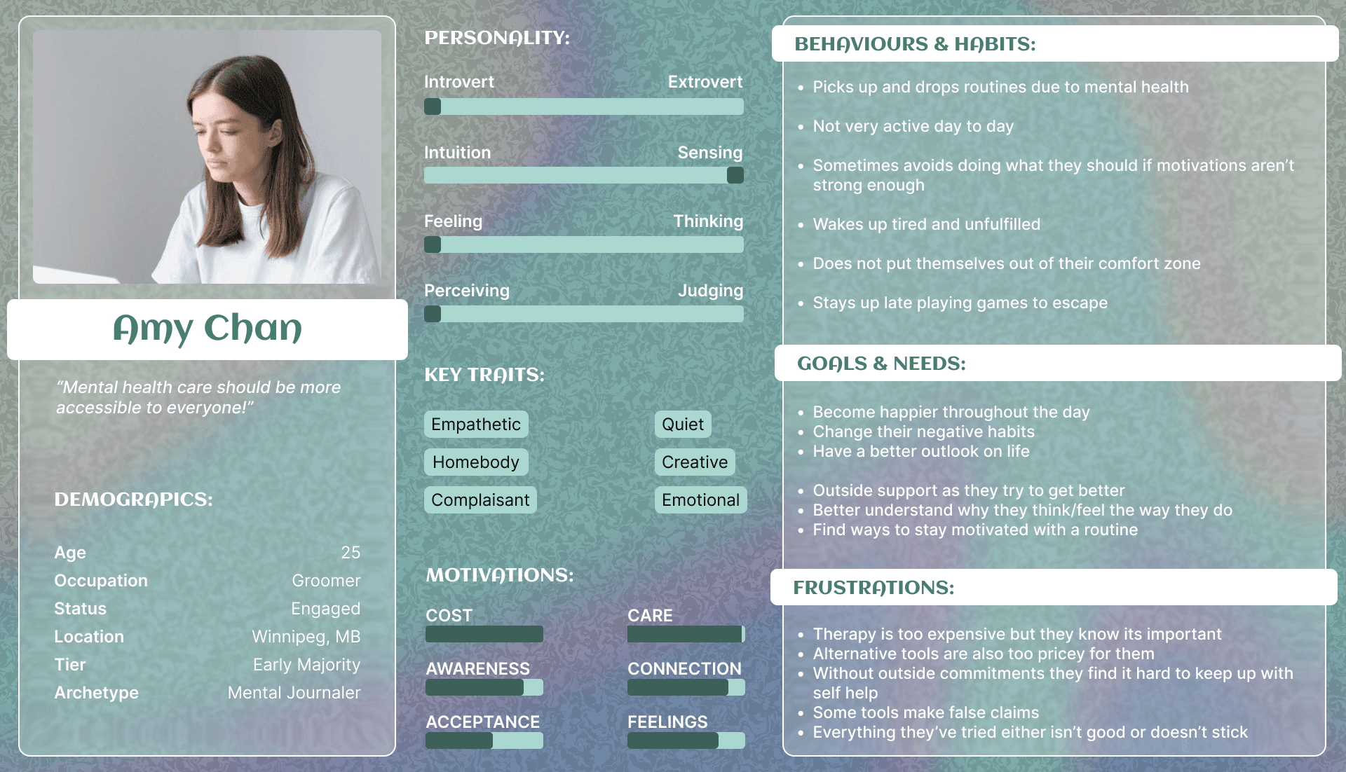 While researching for this project, it was apparent that there was a gap in the market for journaling tools. More importantly there was a gap between access to mental wellness tools for lower income people.