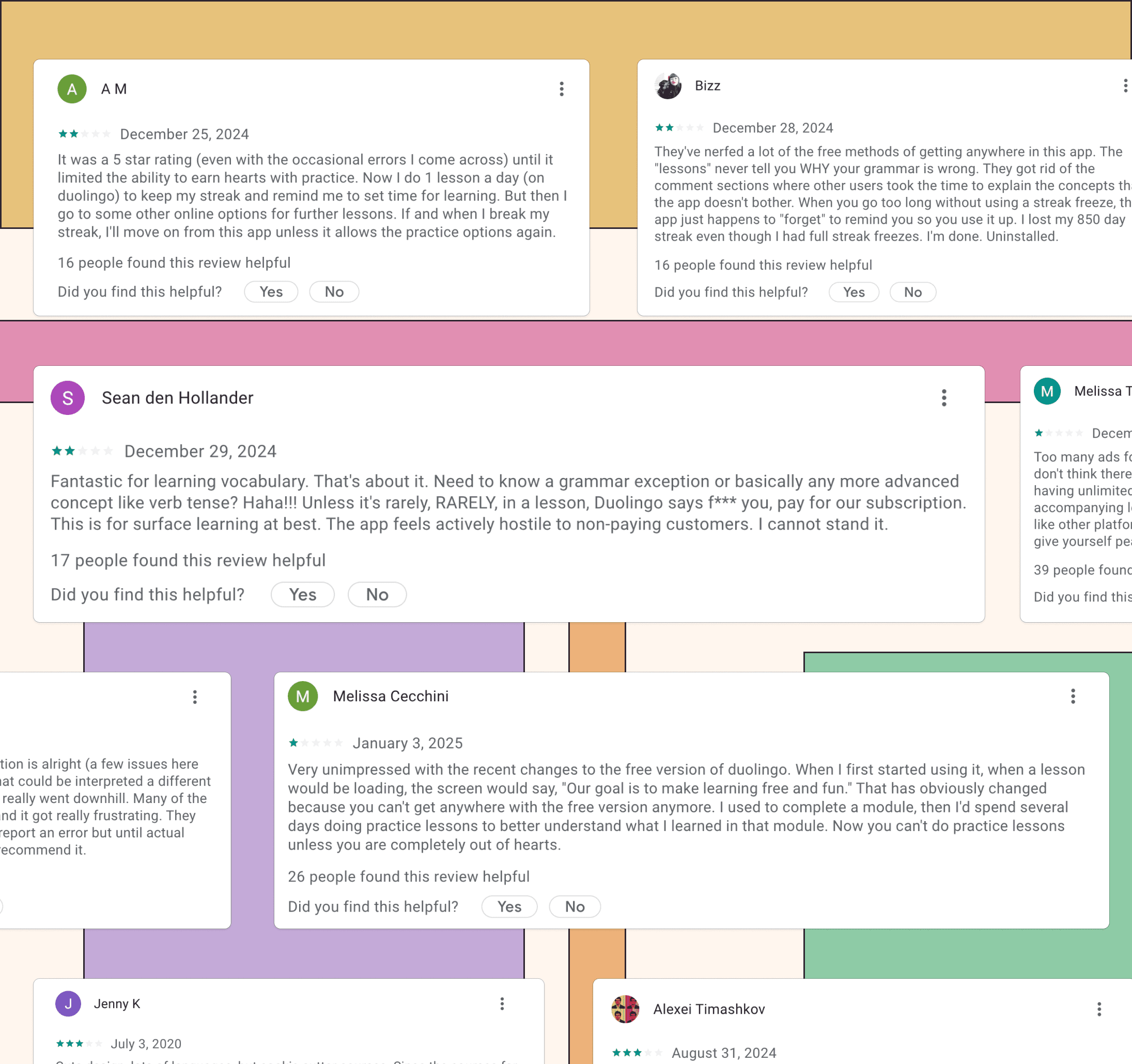 Analysed Reddit discussions, app store reviews, and online articles. Common complaints included slow pacing, limited cultural context, and low personalisation.