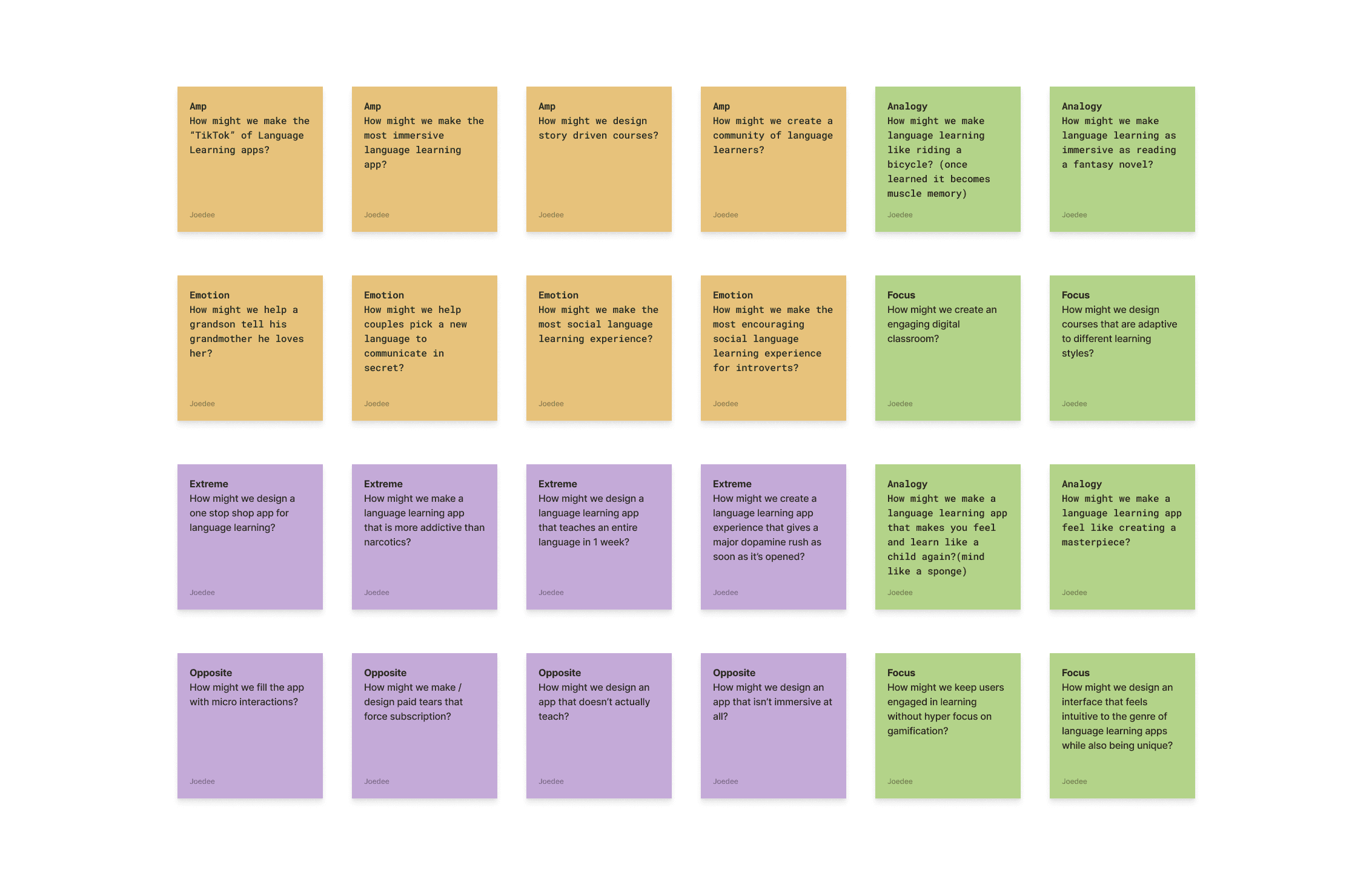 Framed questions like “How might we make language learning feel like real conversation?” to explore broad solution paths.