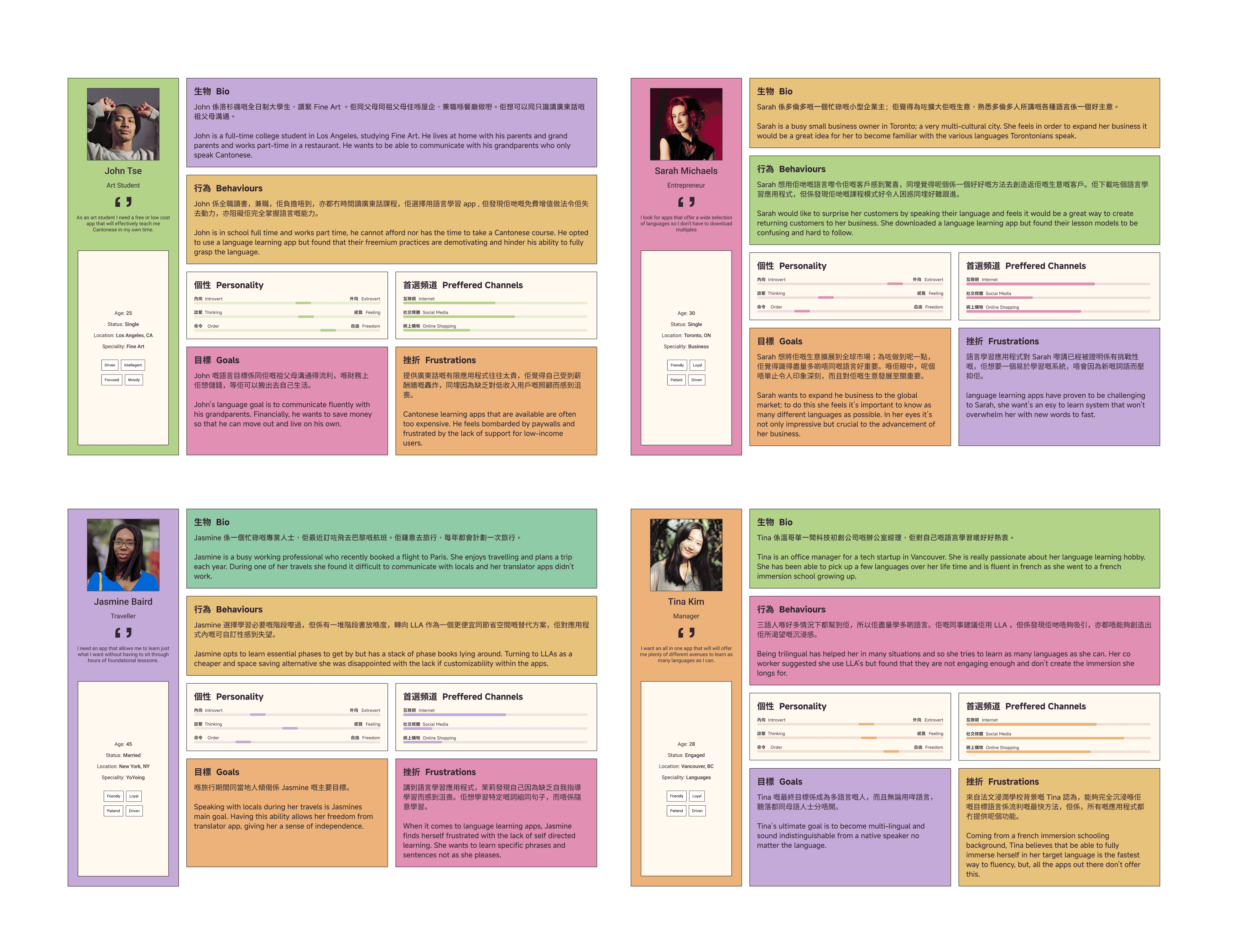 Created 4 distinct personas based on varying needs: cultural reconnection, exam prep, social confidence, and daily practice.