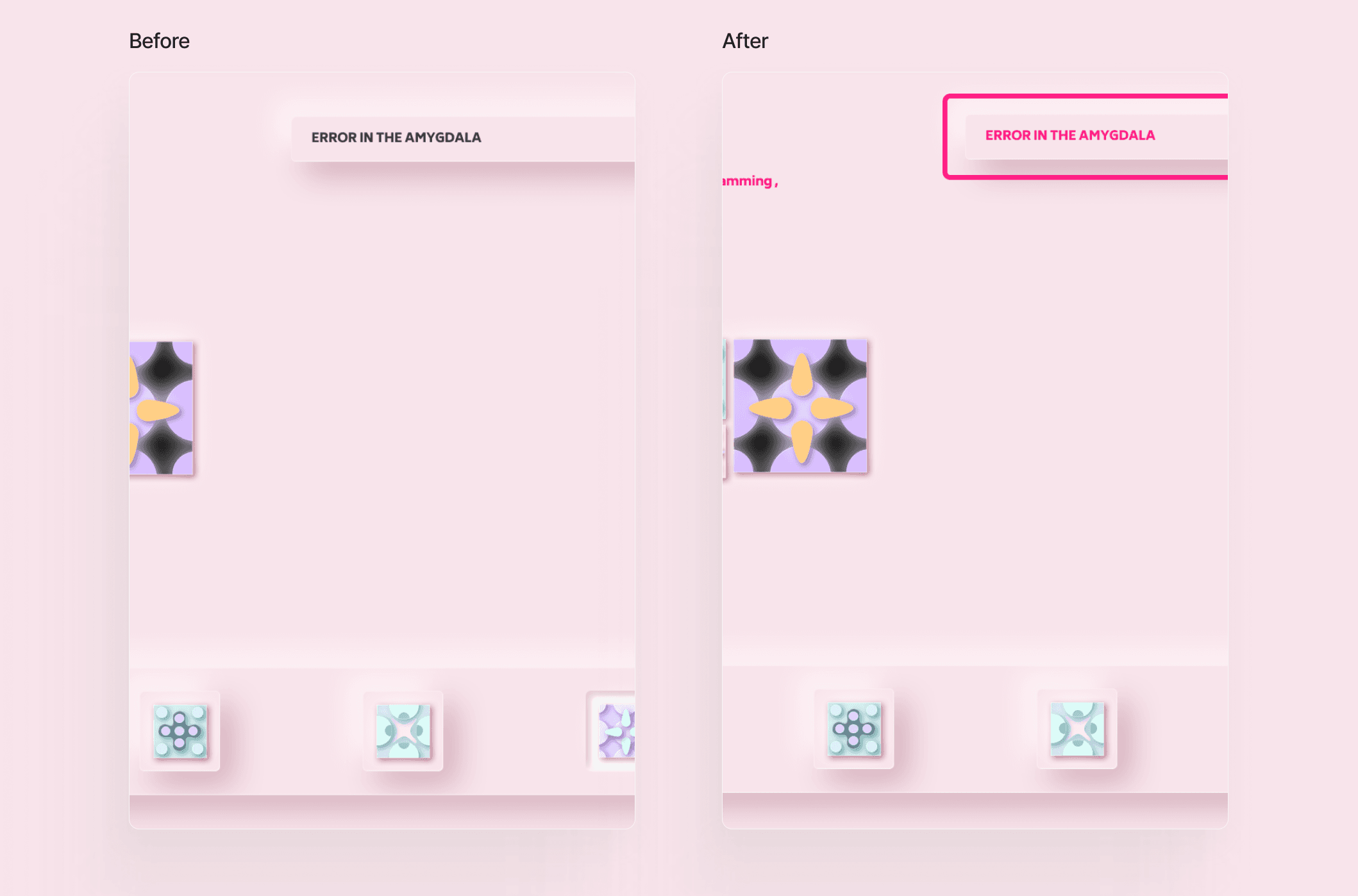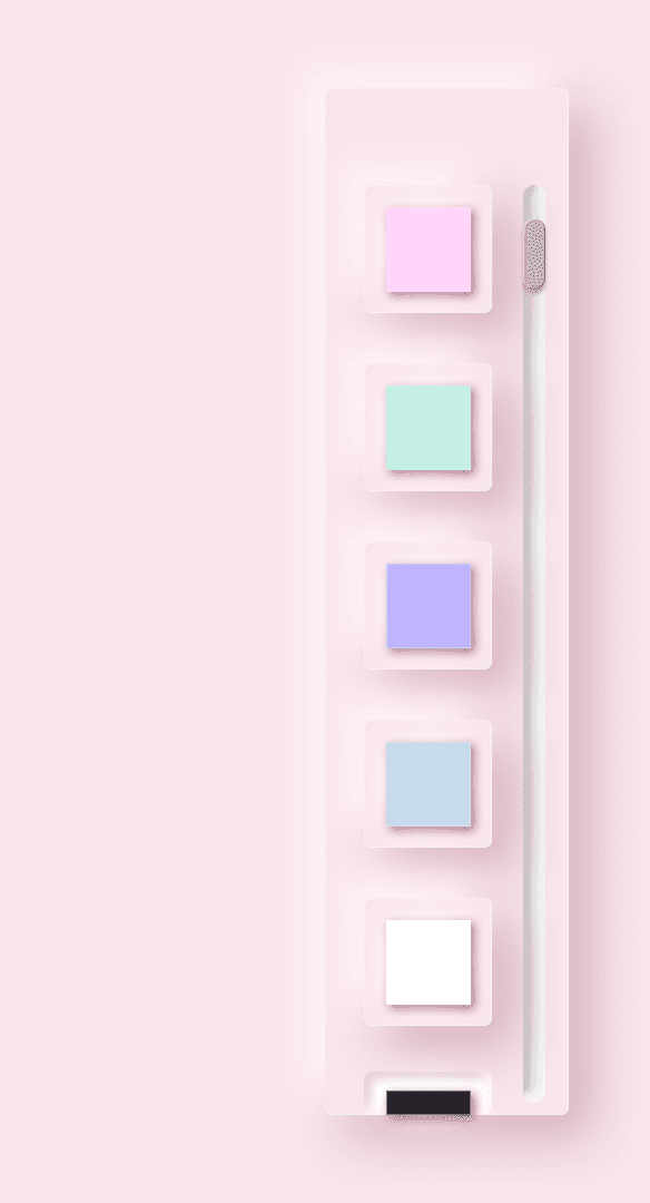 A warm neutral palette supported by muted neons was chosen to soothe while inviting creativity. Typography emphasized clarity and emotion over trendiness.