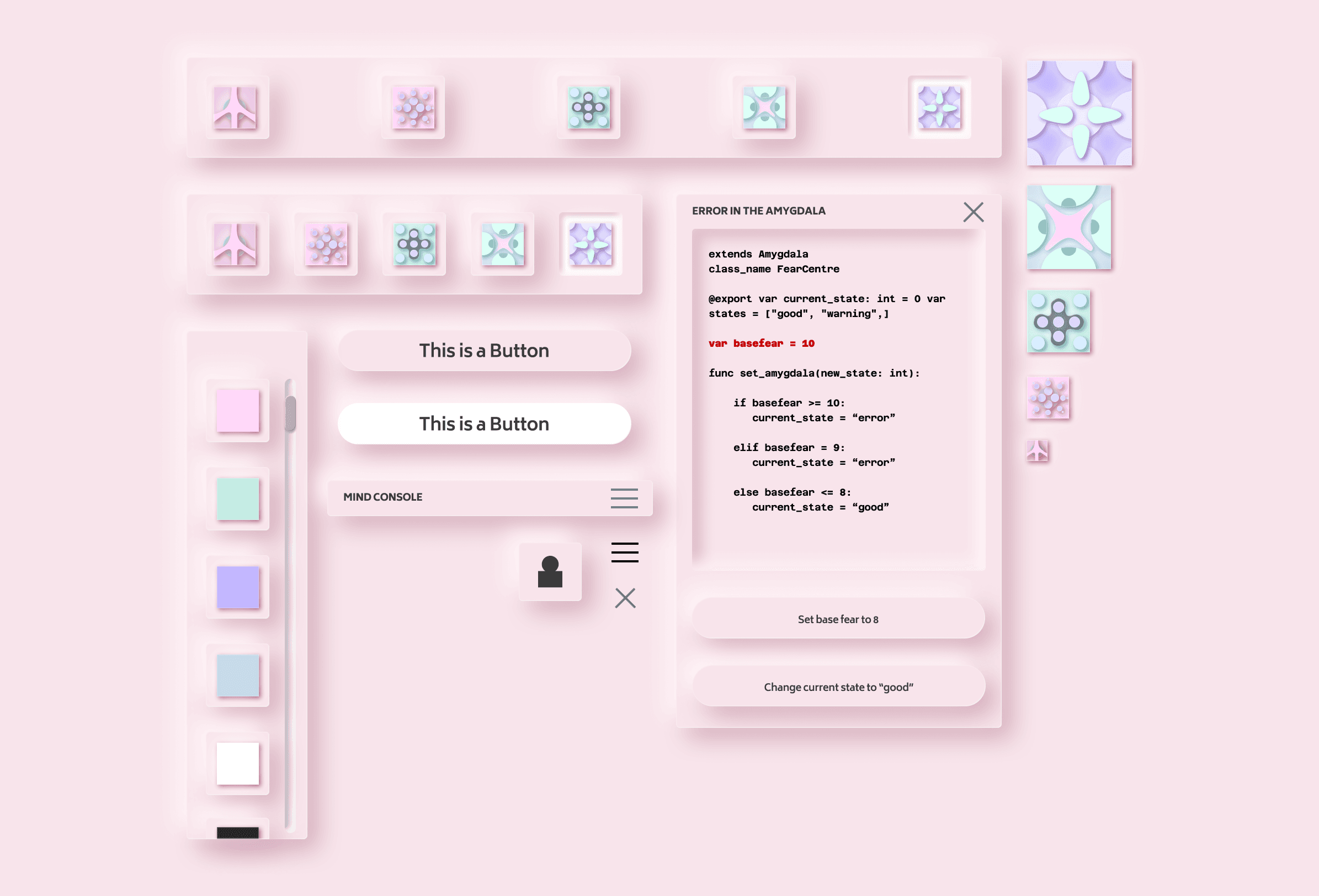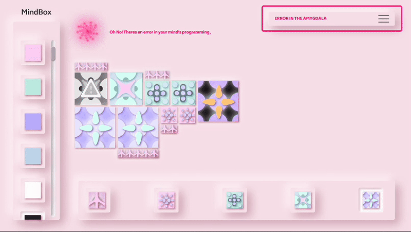 Created a tile system using various shapes, patterns, and colour palettes. Each tile represents a thought, emotion, or behaviour.