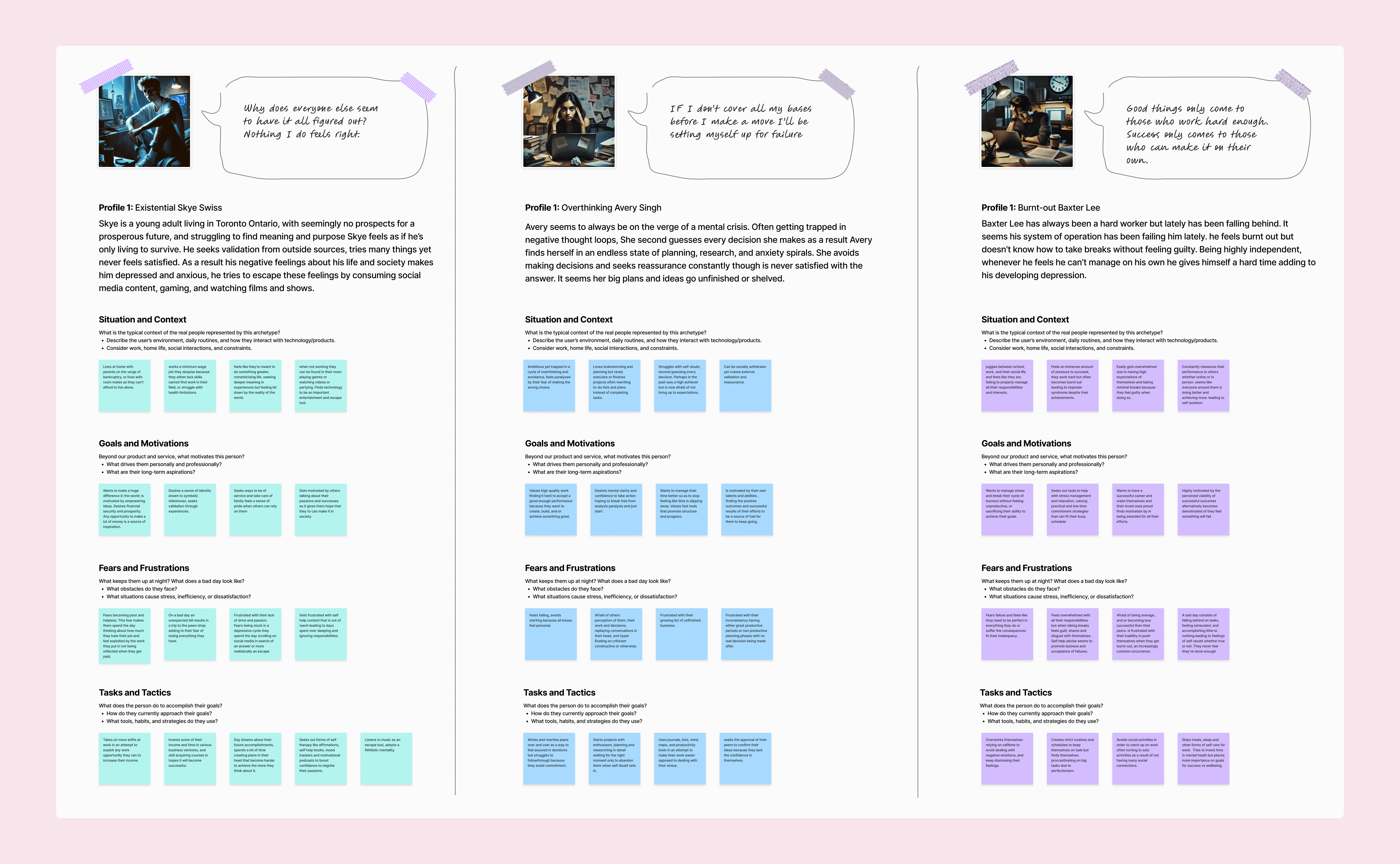 Created 3 original personas and 3 ChatGPT-generated ones to explore emotional goals, digital habits, and creative triggers.