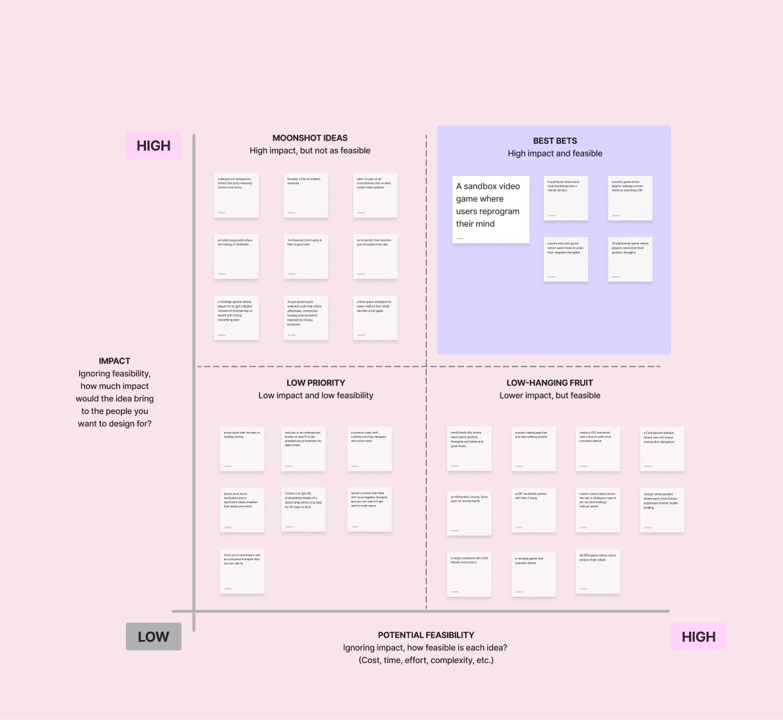 After ideation, I used a decision matrix to score the top ideas based on feasibility and emotional impact. This helped filter high-potential concepts and guided which features to prototype first.