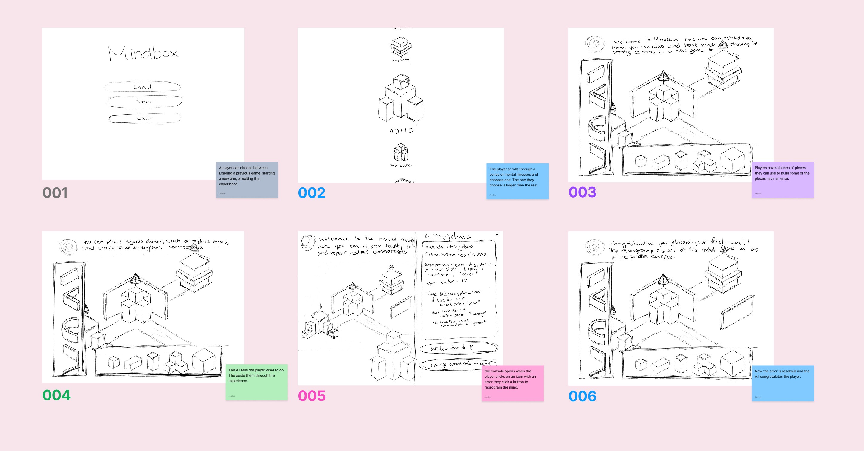 Mindbox is a sandbox-style mental health game designed to help Gen Z users confront and reprogram negative thoughts through interactive CBT mechanics. Set in an abstract mental space, players build mosaic-like brain structures, only to face emotional and cognitive disruptions that must be resolved before creativity can continue. This cycle mirrors real-world self-work and healing.