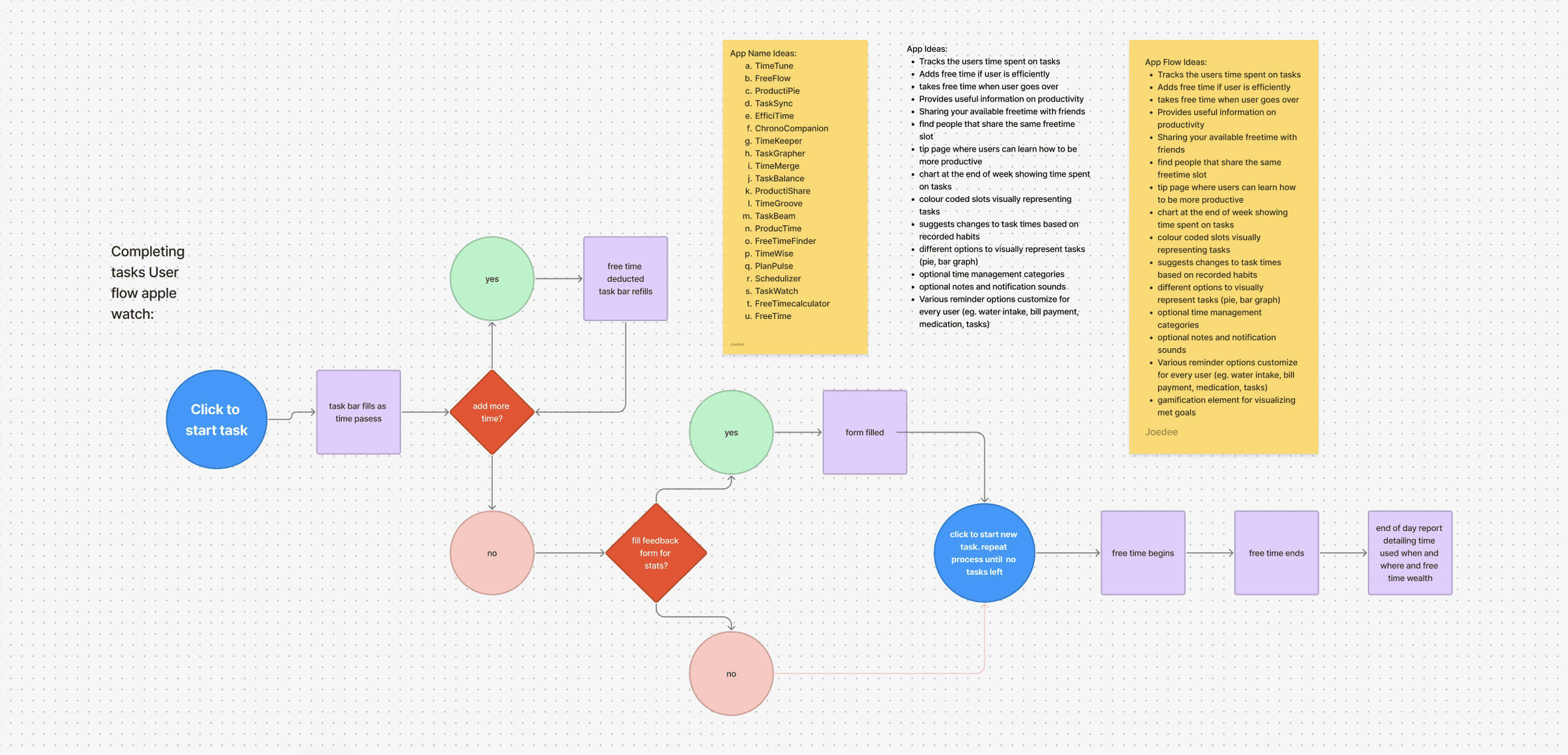 Early brainstorming generated a wide array of features, but many had to be cut to preserve the app's core simplicity and focus on time-as-currency metaphors.