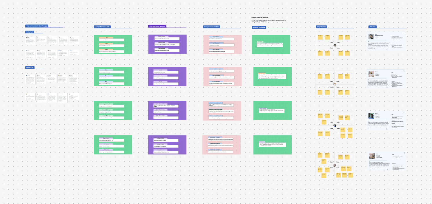 Empathy maps and personas were created based on segmented user complaints. These helped visualise different types of users, their contexts, and their emotional states.