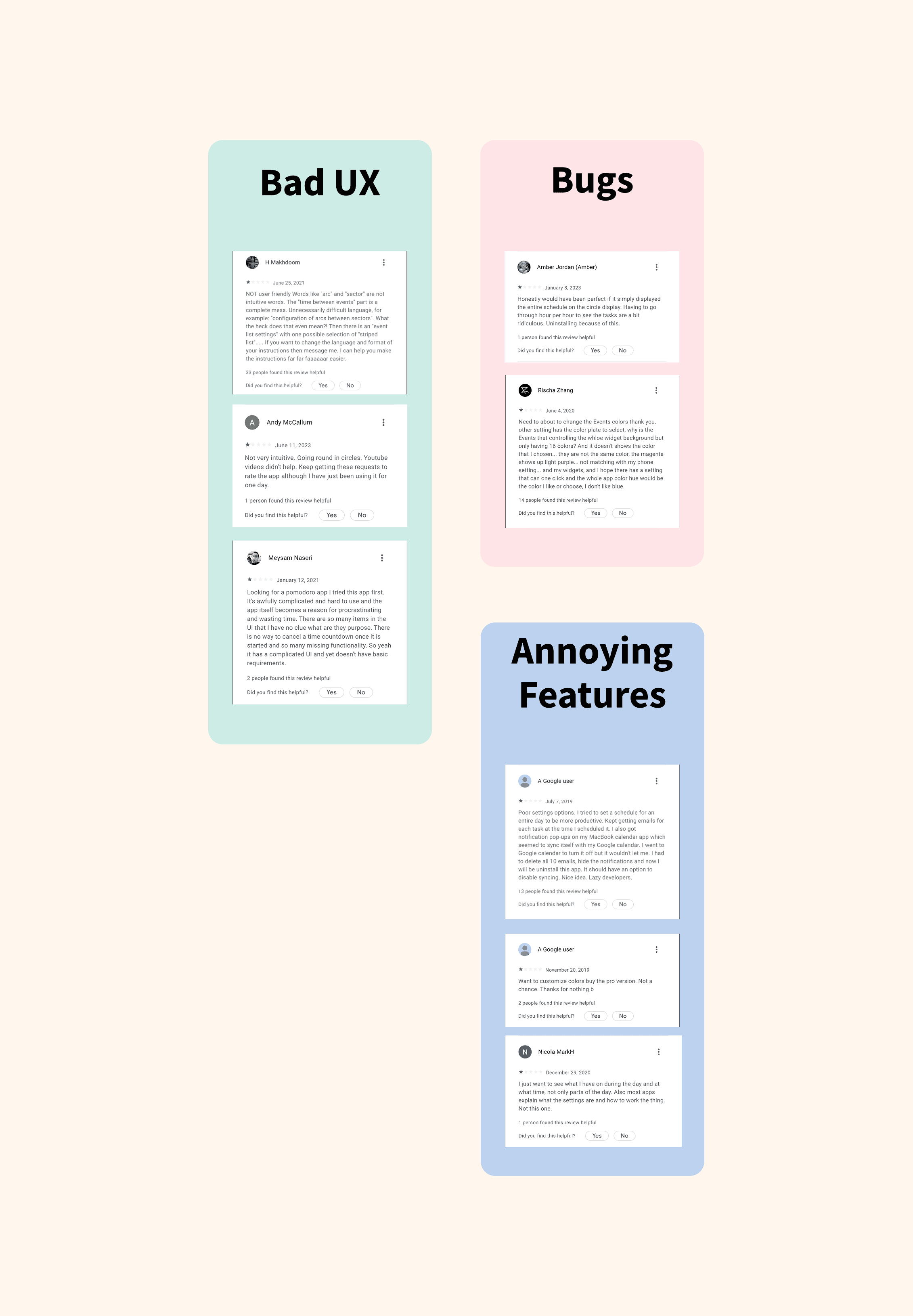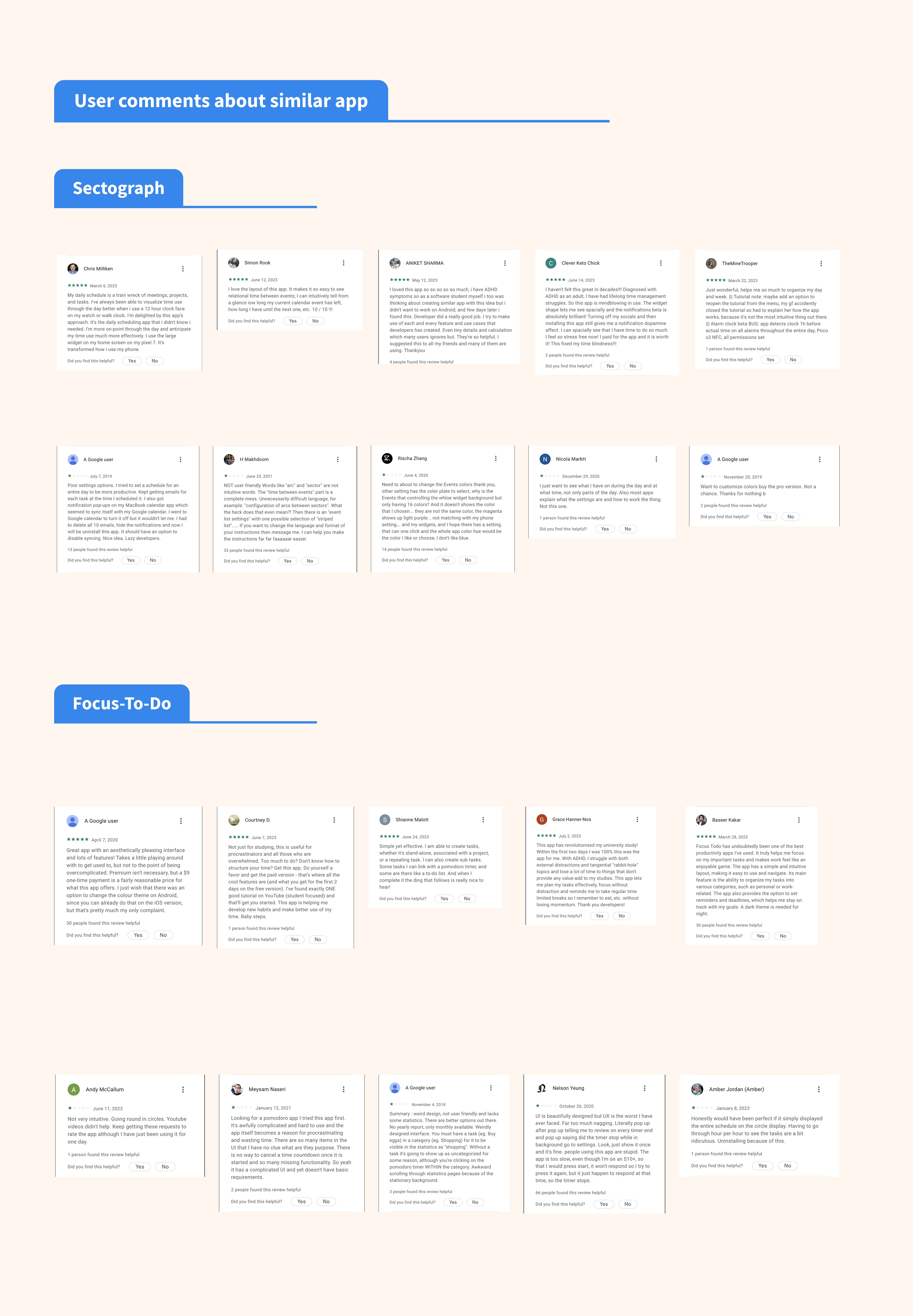 We began by diving into user comments on existing time management apps. Our goal? To identify recurring frustrations and must-have features. Positive reviews helped highlight what users value, while complaints revealed key pain points.